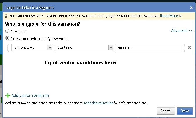 Choose the Only Visitors who qualify a segment to show a certain variation when the condition is met. This lets you set the condition on how your variations are shown to your visitors.